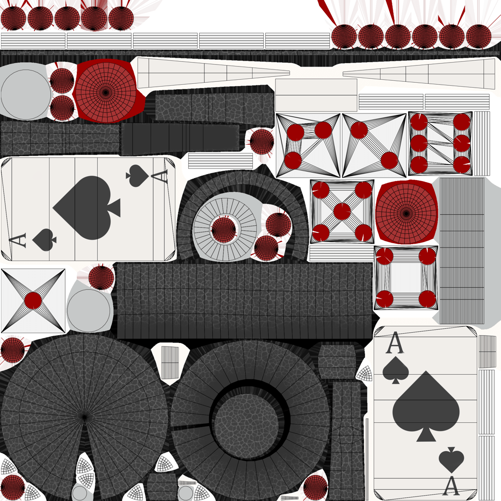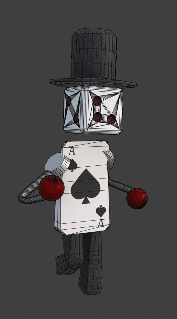 The player character was based off a design I sketched on a white board. I like the idea (especially the modified pattern for the face), but the final model has a number of issues. Limited time meant optimization wasn’t a priority, so what was supposed to be the mid-poly ended up in-game.